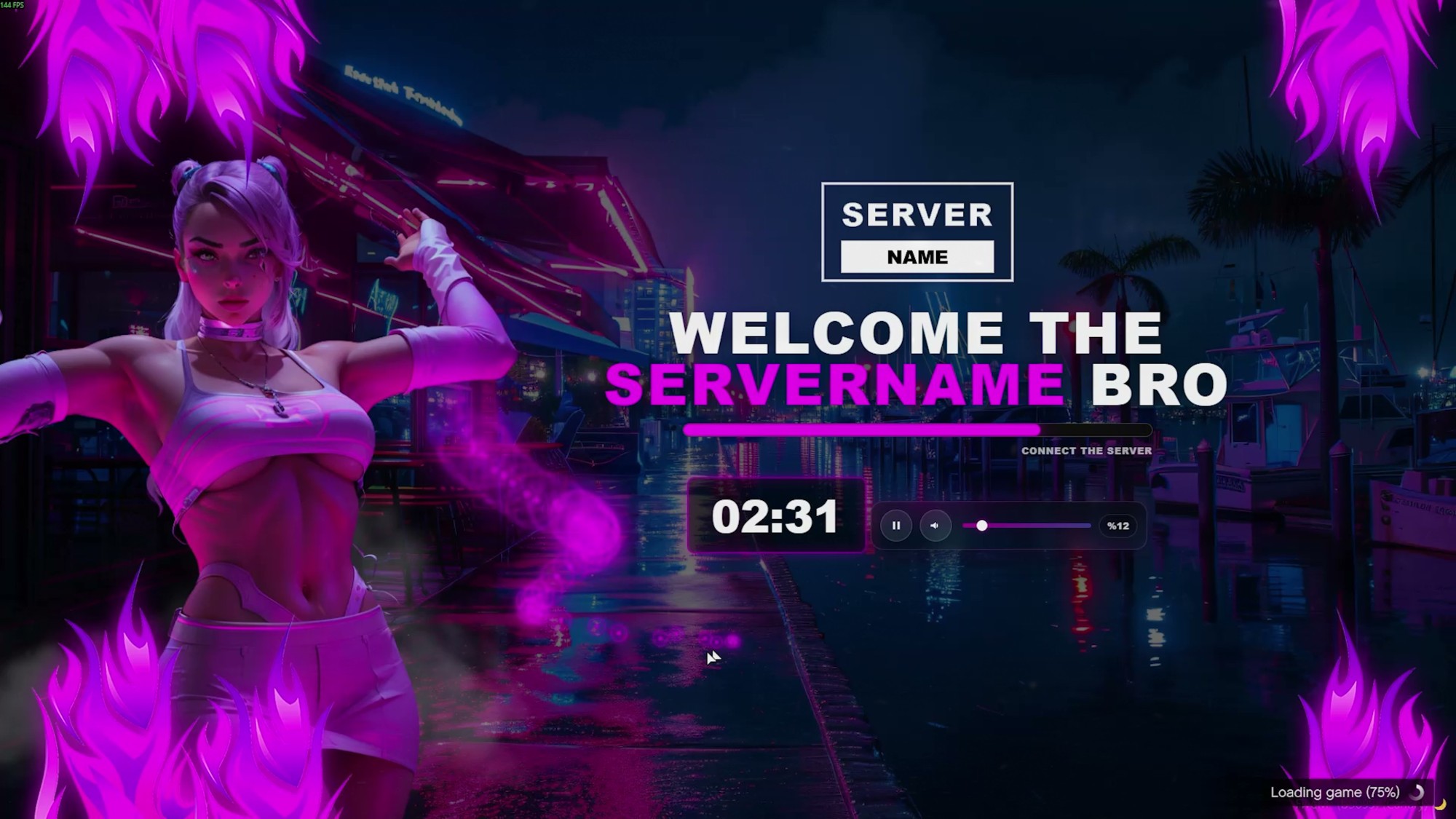Pembe neon cyberpunk estetiği, akıcı animasyonları, entegre müzik sistemi ve canlı dijital saati ile bu yükleme ekranı, sunucunuzun kimliğini ve profesyonelliğini anında yükseltir.